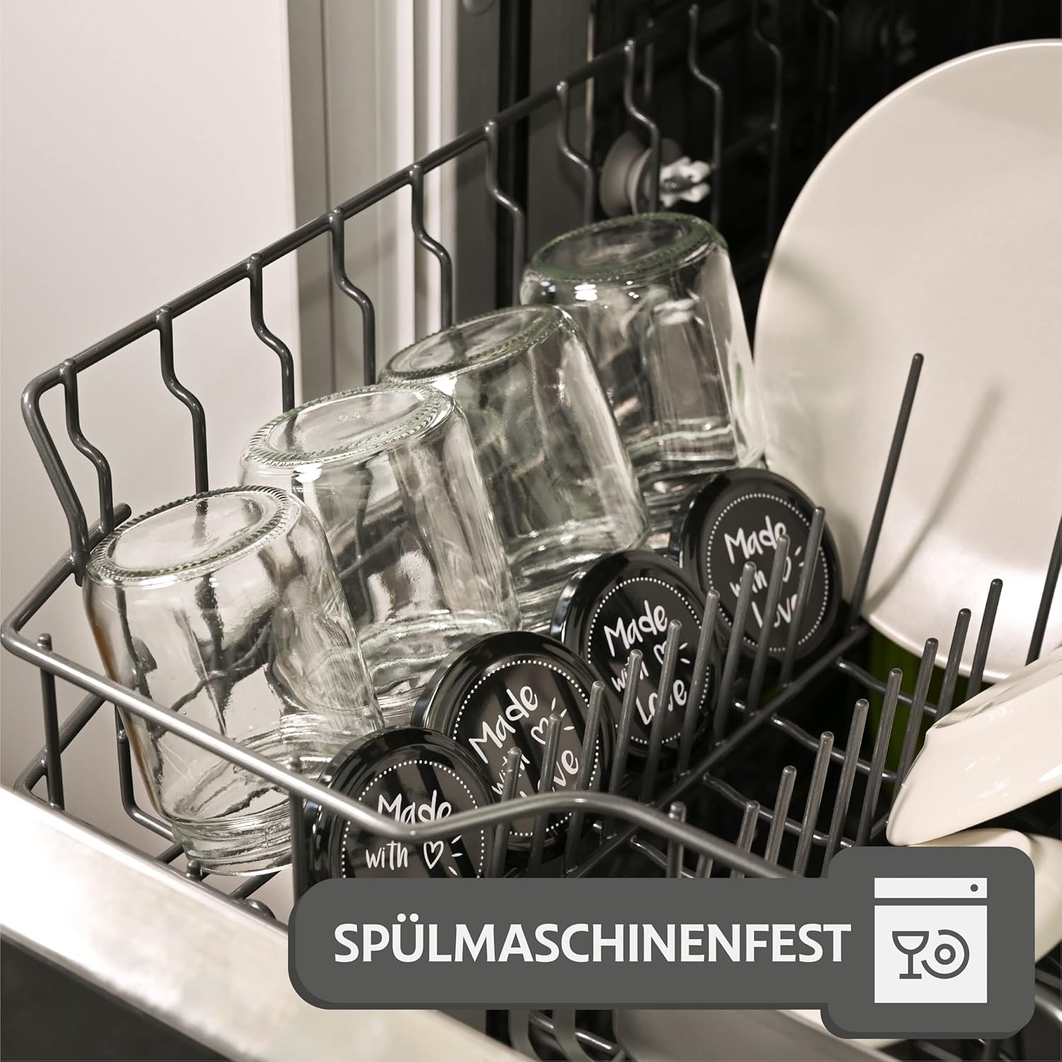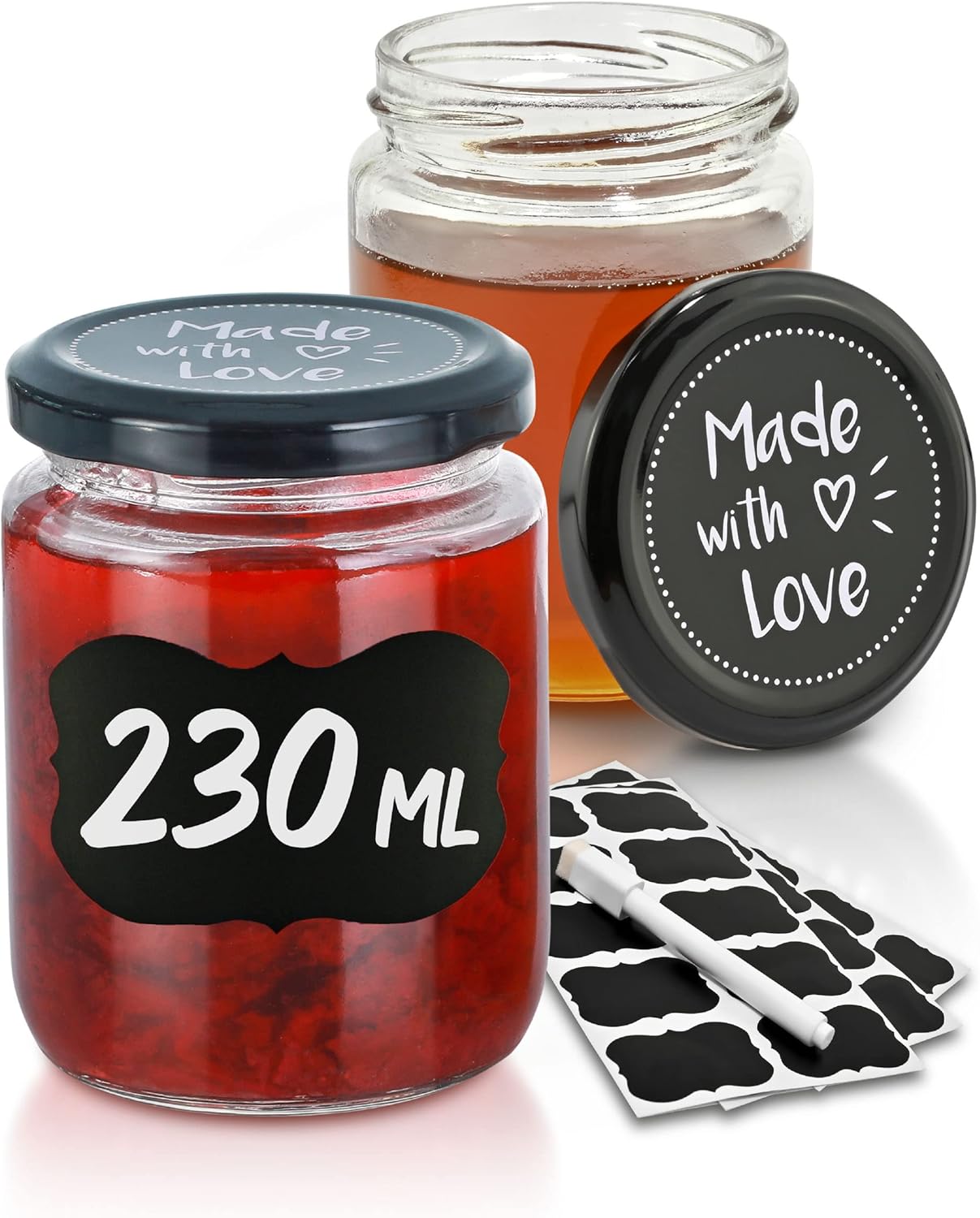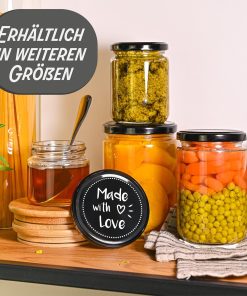 - GLÄSER MIT SCHRAUBDECKEL 25er SET: Füllmenge: 230 ml | Material: Korpus aus Glas | Schraubverschluss aus Metall | Farbe: Schwarze Deckel "Made with Love" | ø 6,5 cm.