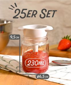 Solides 25er-Set Marmeladengläser (230 ml) mit dicht schließendem Deckel; die Gläser wirken robust, sind spülmaschinenfest und die beiliegenden Etiketten samt Stift erleichtern das Beschriften, wodurch sich das Set gut zum Verschenken oder zum Einmachen eignet.