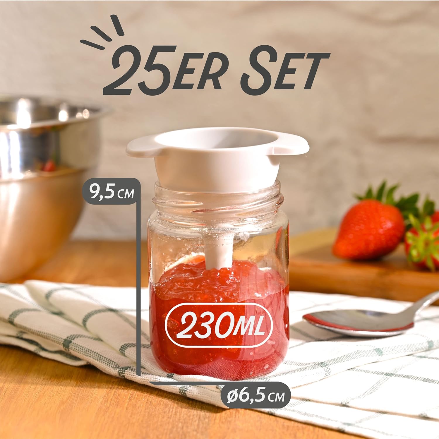 Tolles Set mit 25 Gläsern à 230 ml: die Deckel schließen zuverlässig, die Etiketten und der Stift sind praktisch zum Beschriften und halten gut. Die Gläser wirken stabil, sind spülmaschinenfest und eignen sich perfekt zum Einkochen oder als hübsches Mitbringsel.