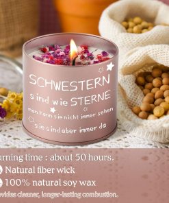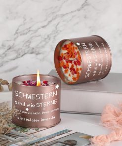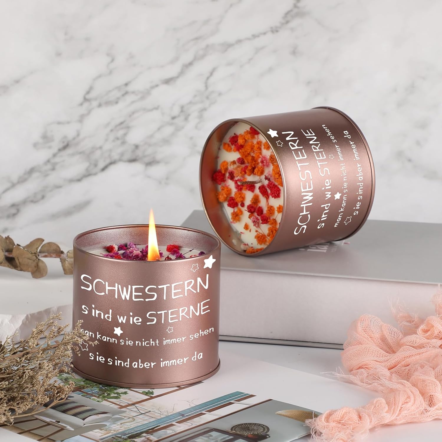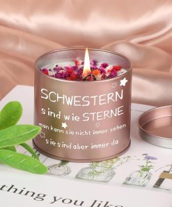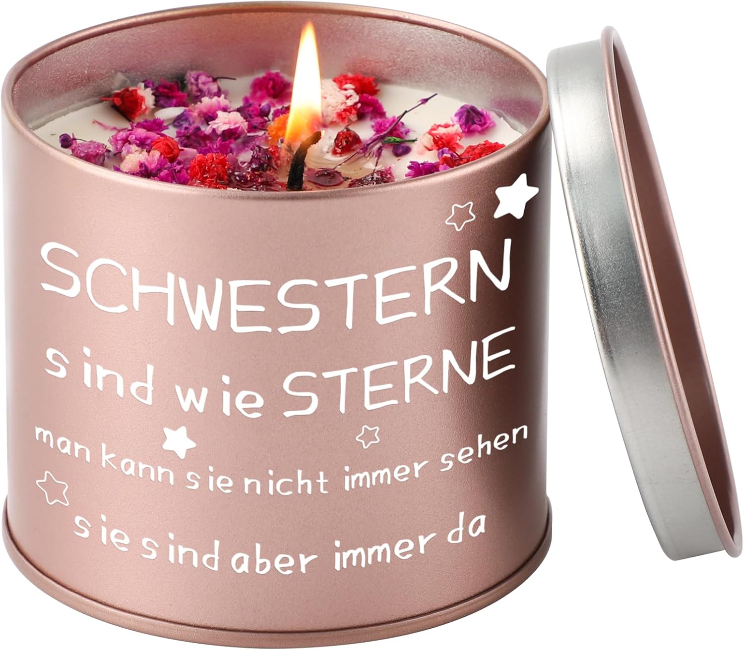 Schöne Kerze als Geschenk für die Schwester: dezenter, angenehmer Duft, stabile Verarbeitung und der Spruch wirkt nett ohne kitschig zu sein; kommt gut verpackt und eignet sich für Geburtstag, Weihnachten oder als kleine Aufmerksamkeit.