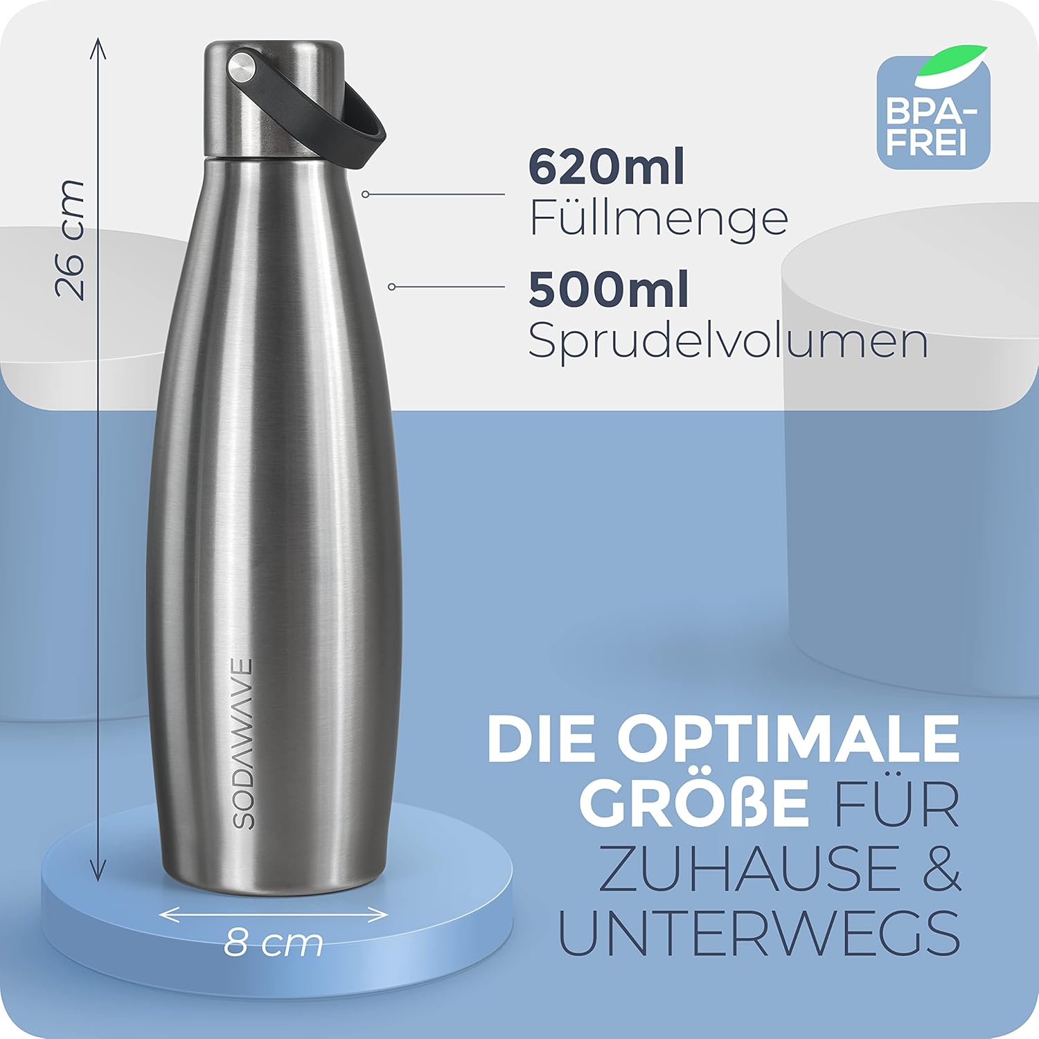 Die SODAWAVE Trinkflasche aus Edelstahl (620 ml) ist praktisch für unterwegs: sie wirkt robust, hält Getränke lange warm oder kalt und bleibt zuverlässig auslaufsicher. Die Größe ist alltagstauglich und die Reinigung unkompliziert. Insgesamt eine empfehlenswerte Wahl.