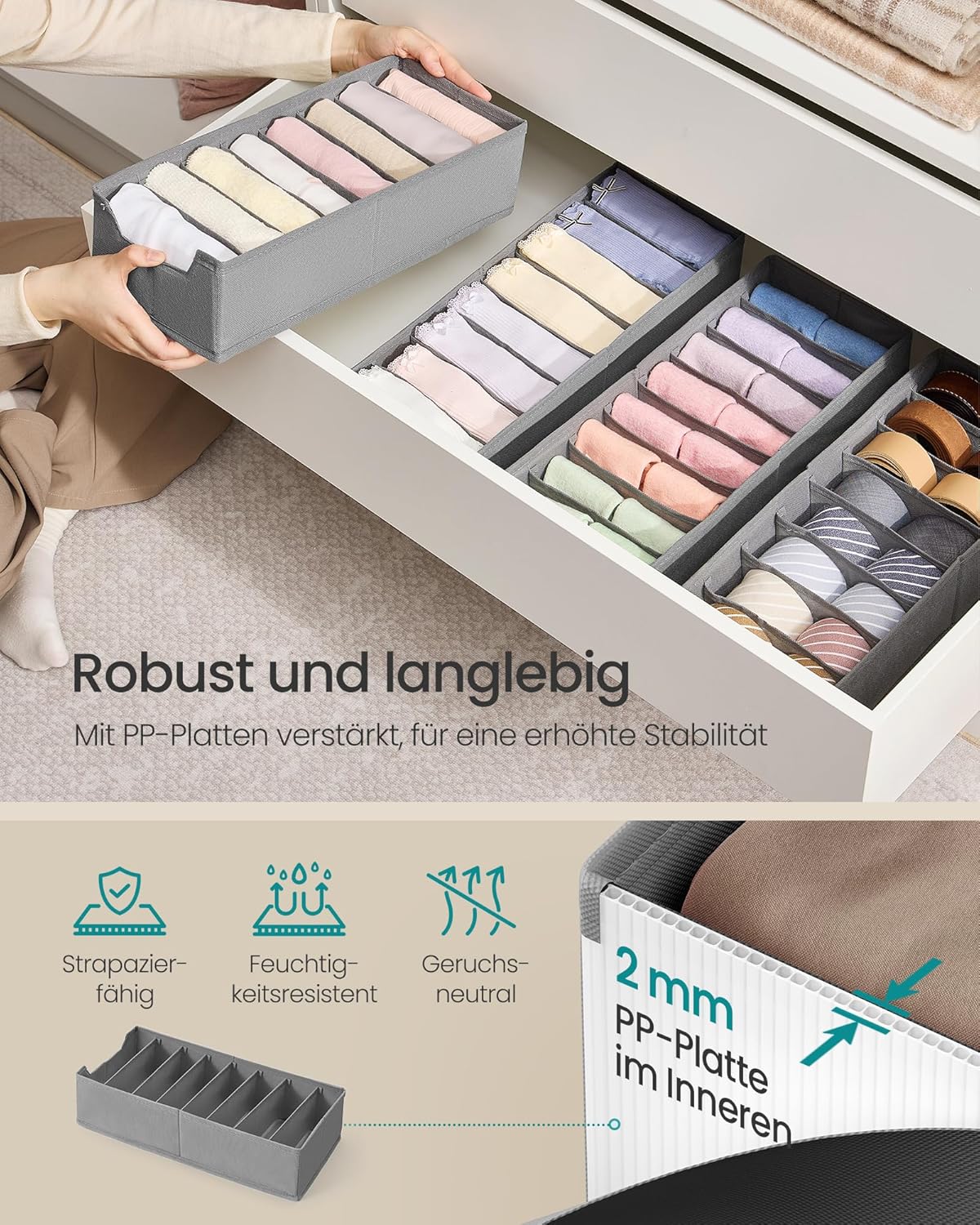 - Langlebig & geruchsneutral: Aus atmungsaktivem Vliesstoff und stabilen 2 mm dicken PP-Platten hergestellt, sind die Unterwäsche-Organizer feuchtigkeitsresistent, geruchsneutral und langlebig und verformen sich nicht leicht