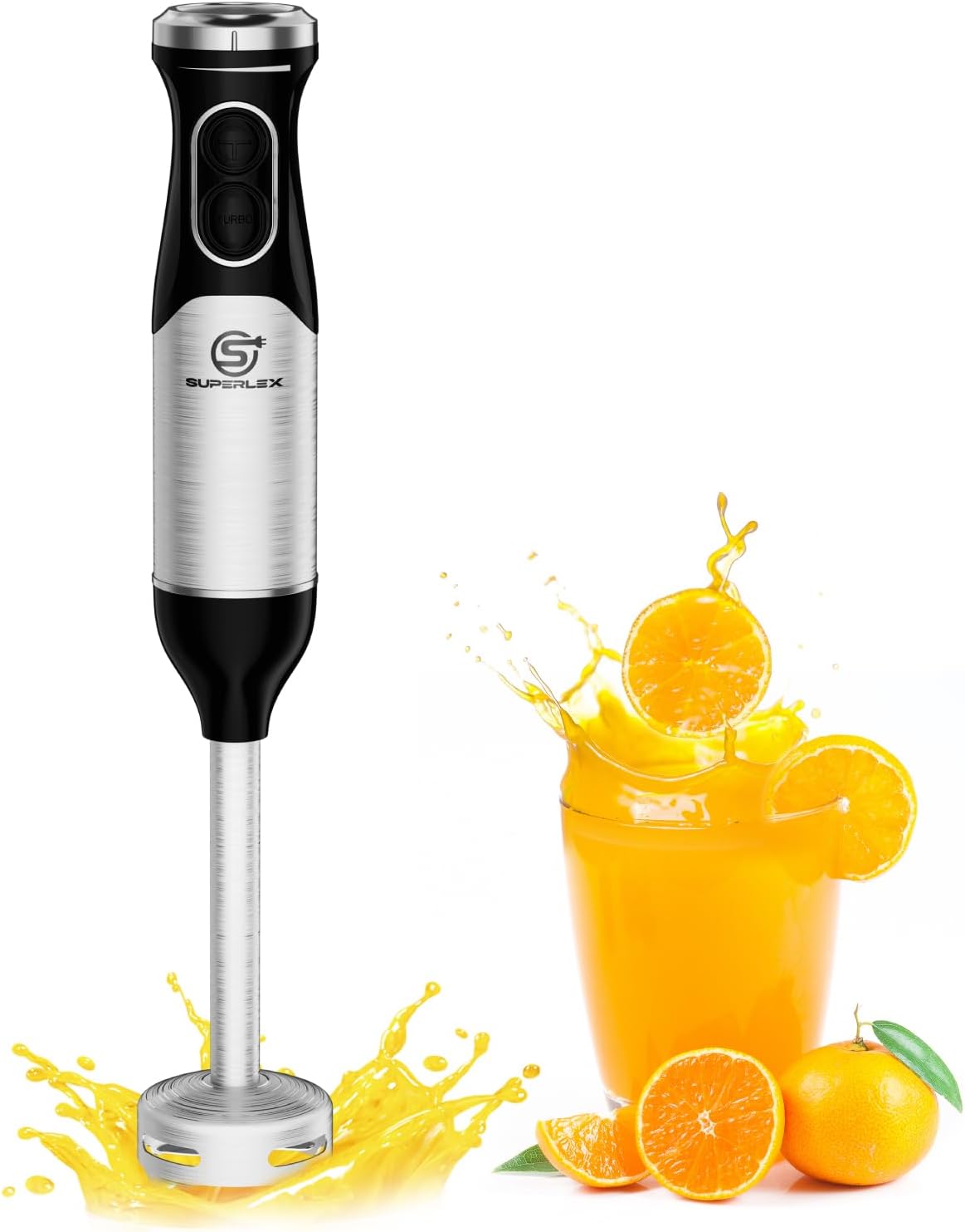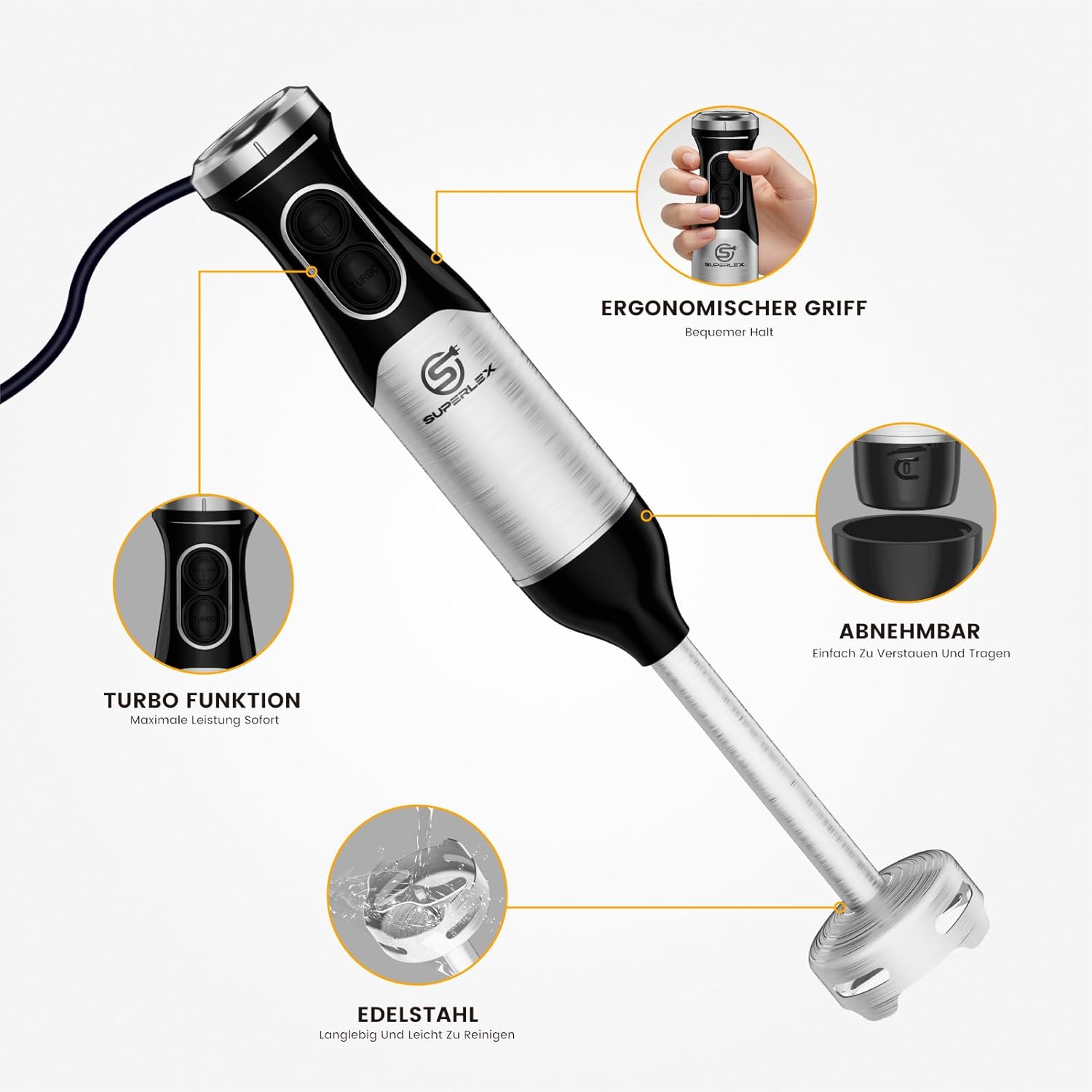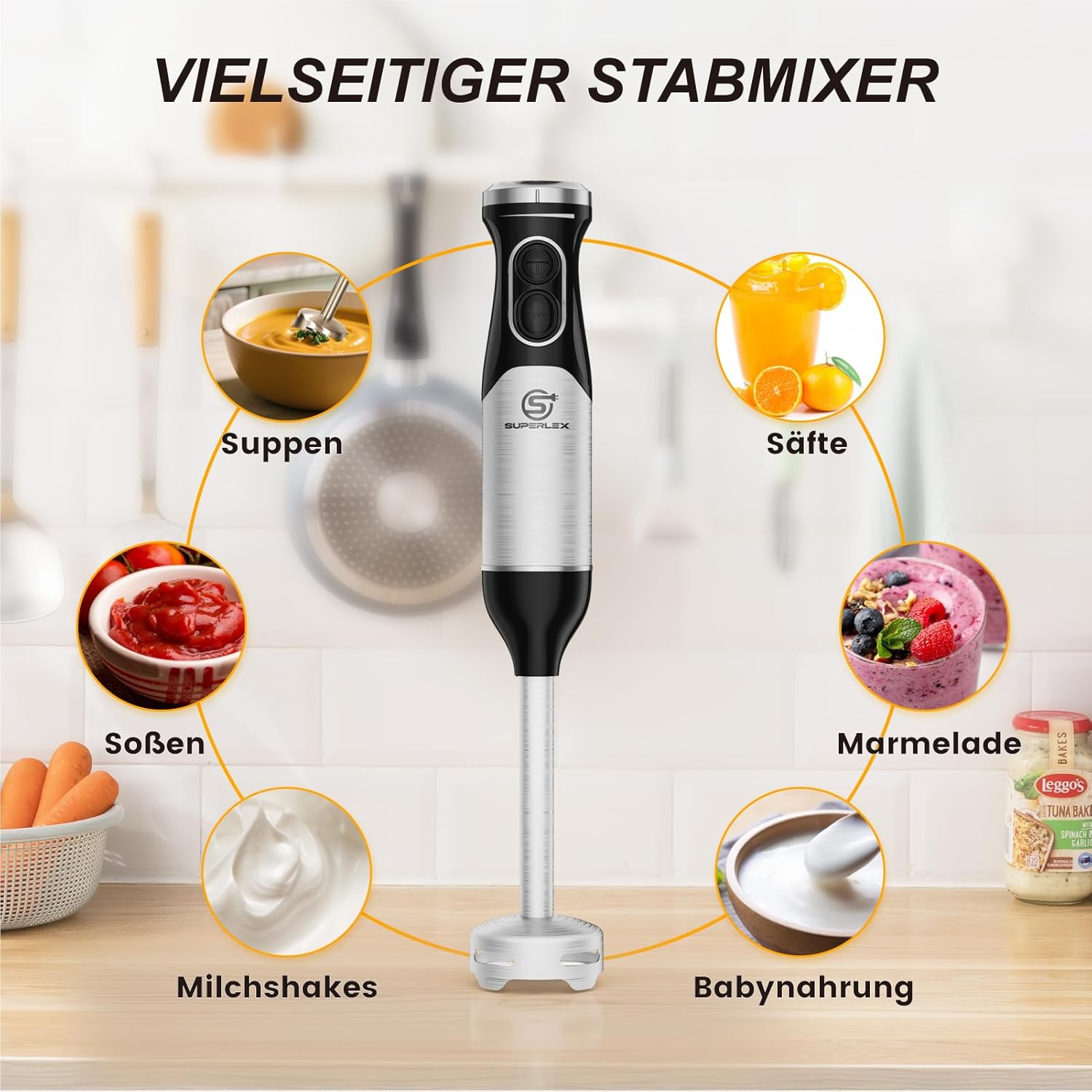 Der SUPERLEX Stabmixer hat mich beeindruckt: kraftvoll, einfach in der Handhabung und mit zwei Geschwindigkeiten plus Turbo ideal für Suppen, Saucen und Babynahrung. Das ergonomische, kompakte Design liegt gut in der Hand und die Reinigung ist unkompliziert – ein zuverlässiger Küchenhelfer, den ich gern empfehle.