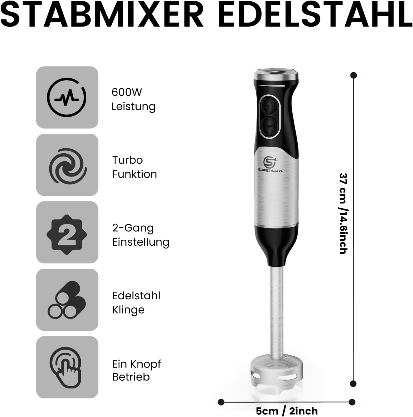 Der SUPERLEX Stabmixer überzeugt durch solide Verarbeitung und die 600W Leistung; die zwei Geschwindigkeiten plus Turbofunktion machen ihn vielseitig für Suppen, Saucen, Babynahrung und Shakes. Das ergonomische, kompakte Design liegt gut in der Hand und die Bedienung ist unkompliziert, so dass er sich schnell im Alltag bewährt. Insgesamt ein zuverlässiger, platzsparender Küchenhelfer.