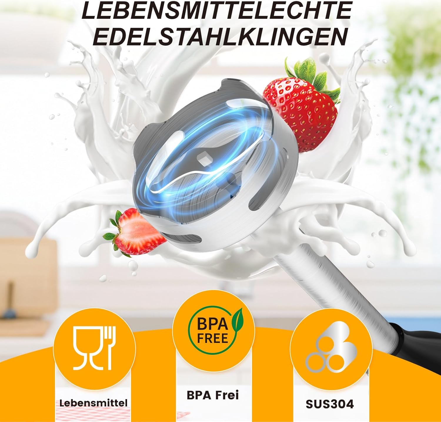 - Einfache Reinigung – Der Hand Blender ist komplett zerlegbar und BPA-frei. Alle Teile können schnell abgespült werden, sodass die Reinigung nach dem Kochen besonders einfach und zeitsparend ist – perfekt für vielbeschäftigte Haushalte.