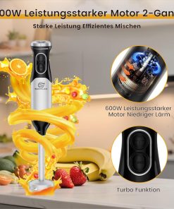 - Zwei Geschwindigkeitsstufen – Der leistungsstarke elektrische Stabmixer mit 600W Motor bietet zwei Geschwindigkeiten und Turbofunktion. Er zerkleinert harte Zutaten, mixt Suppen, Saucen, Babynahrung und Smoothies mühelos – ideal für den täglichen Einsatz.