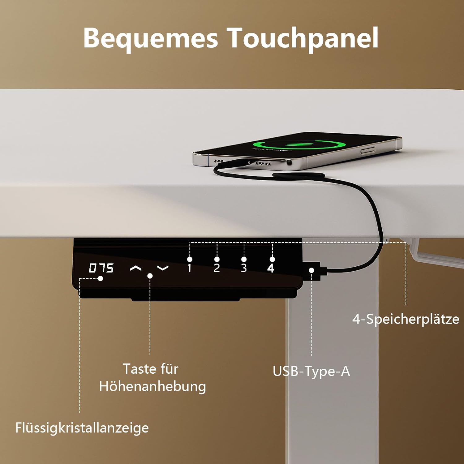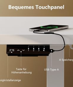 - 【Intuitive Bedienung mit Touchscreen】Der Stehschreibtisch bietet einen Touchscreen mit 4 speicherbaren Höhenprofilen (72-122 cm) – perfekt für Familien oder vielfältige Nutzungsszenarien. Integrierter USB-A-Ladeanschluss ersetzt zusätzliche Adapter für Smartphones oder Tablets