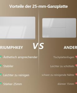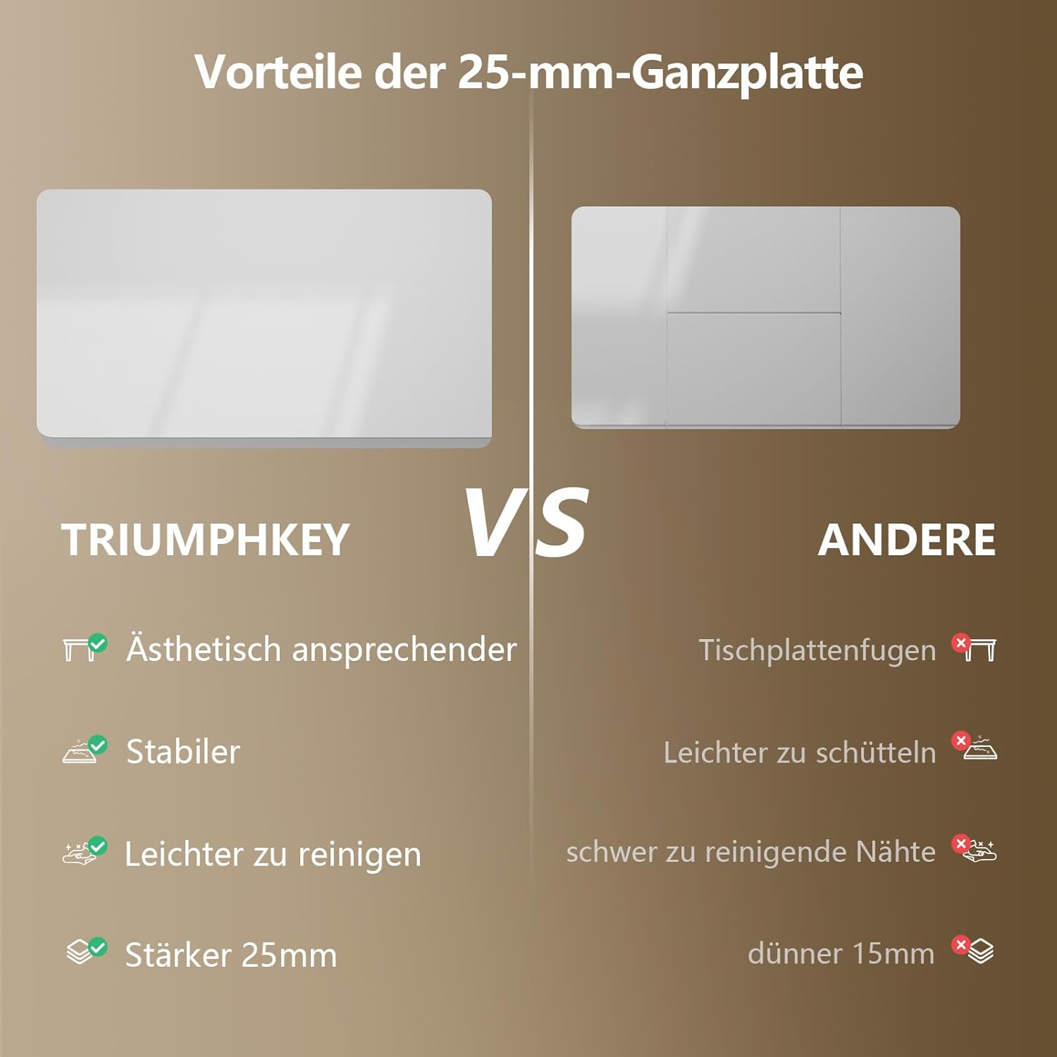 Der TRIUMPHKEY höhenverstellbare Schreibtisch überzeugt: die 160×80 cm Tischplatte ist stabil, der Dualmotor hebt und senkt leise, das Touch-Panel mit USB-Anschluss ist praktisch und das Kabelmanagement sorgt für Ordnung. Der Aufbau war unkompliziert und die weiße Oberfläche passt gut ins Homeoffice, insgesamt ein toller Kauf für ergonomisches Arbeiten.