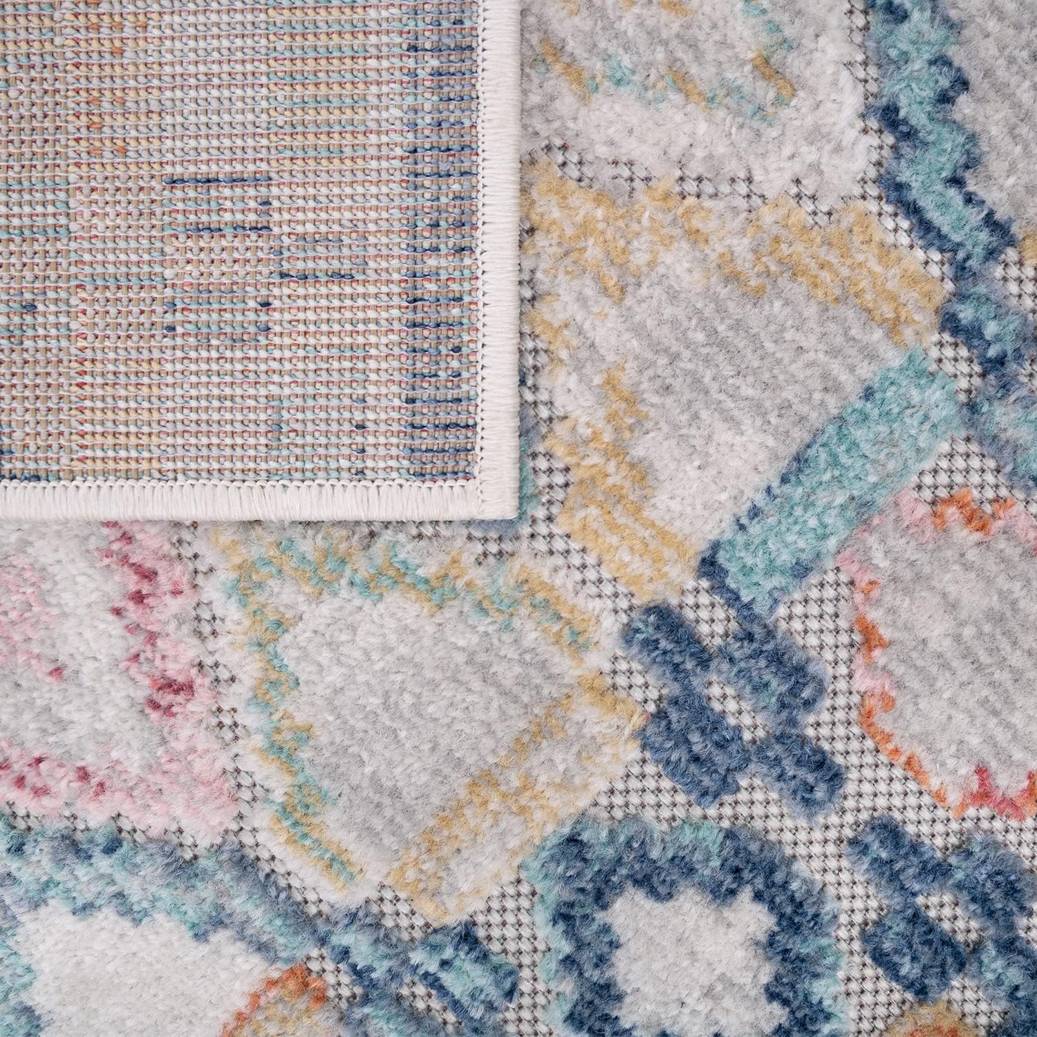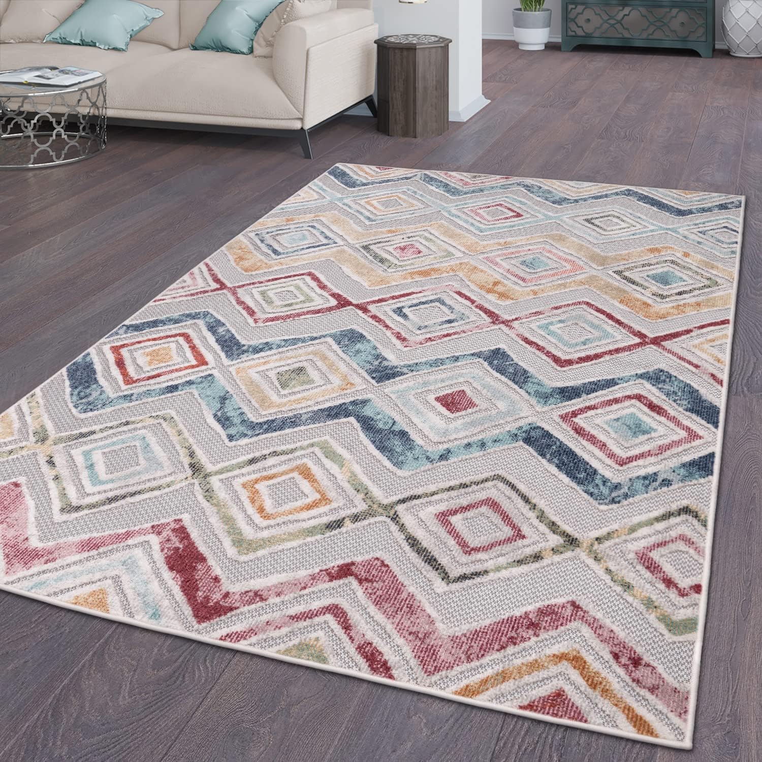 Schöner, gut verarbeiteter In- und Outdoorteppich mit lebendigen Rot-, Blau- und Gelbtönen; das Rautenmuster wirkt modern und die Größe 80×150 cm passt gut auf Terrasse oder Balkon. Er wirkt robust, lässt sich leicht reinigen und bietet ein gutes Preis-Leistungs-Verhältnis.