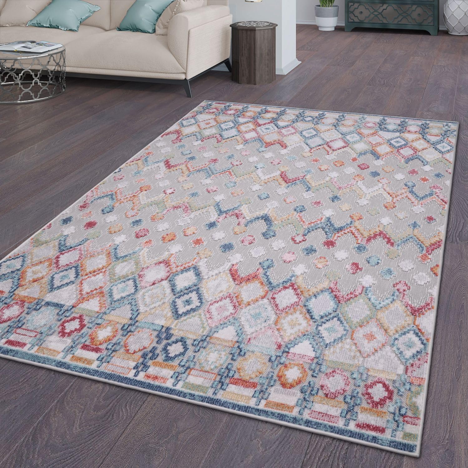 Der TT Home In- & Outdoorteppich überzeugt durch wetterfestes Material und kräftige Rot-, Blau- und Gelbtöne; das geometrische Rautendesign wirkt modern und die Größe 80×150 cm eignet sich gut für Terrassen oder Balkone. Verarbeitung und Material machen einen robusten Eindruck, der Teppich lässt sich leicht reinigen und liegt rutschfest, insgesamt ein empfehlenswertes Produkt.