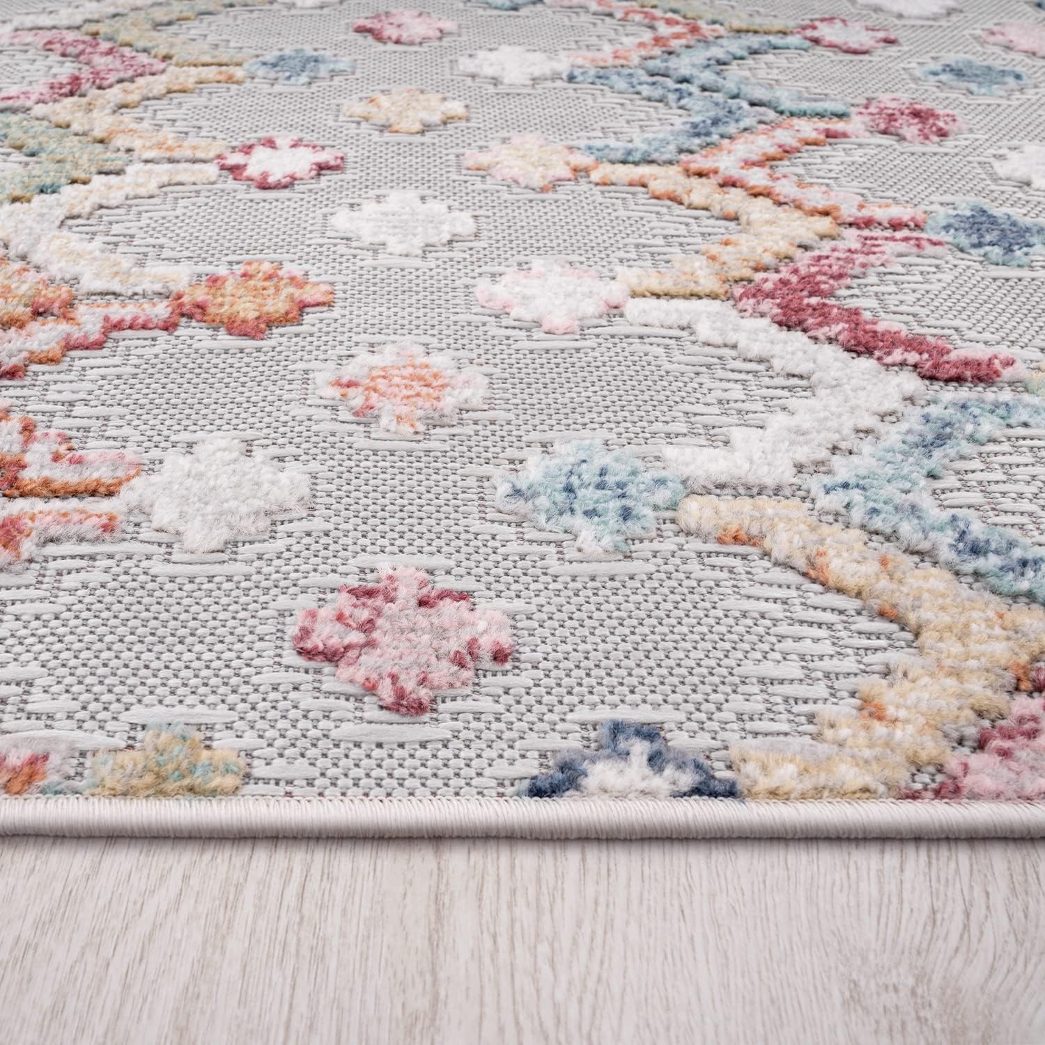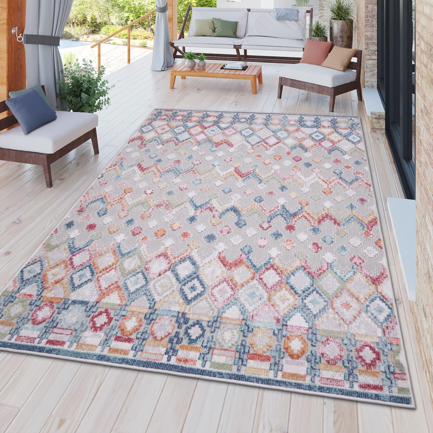 Der Teppich sieht in echt noch besser aus als auf den Bildern: die Farben Rot, Blau und Gelb sind kräftig, das Rautenmuster wirkt modern und er ist wirklich wetterfest und leicht zu reinigen. Die Größe 80×150 cm passt perfekt vor unserer Terrassentür, liegt flach und rutscht kaum — ideal für draußen. Bewertung: 5