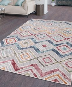 TT Home In-& Outdoorteppich Wetterfest Terrasse Rauten Geometrisches Abstraktes Design, Farbe: Rot Blau Gelb, Größe:80×150 cm