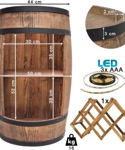 - Hohe Qualität: Massives hartes Buchenholz Dicke des Holzes ca. 2 cm schwarze Metallverstärkungsringe, 3 cm breit. Größe 80x50x44cm. W:16kg. Weinständer aus Kiefernholz. LED-Beleuchtung – LED-Beleuchtungsdauer – ca. 120 Stunden – manueller Schalter.