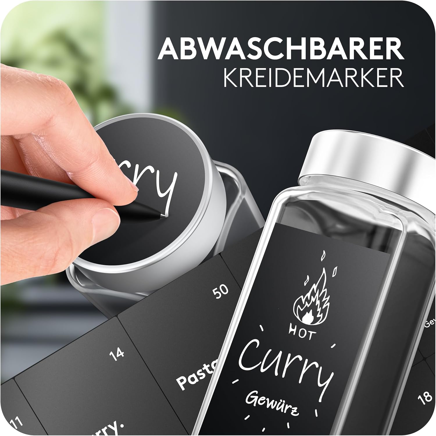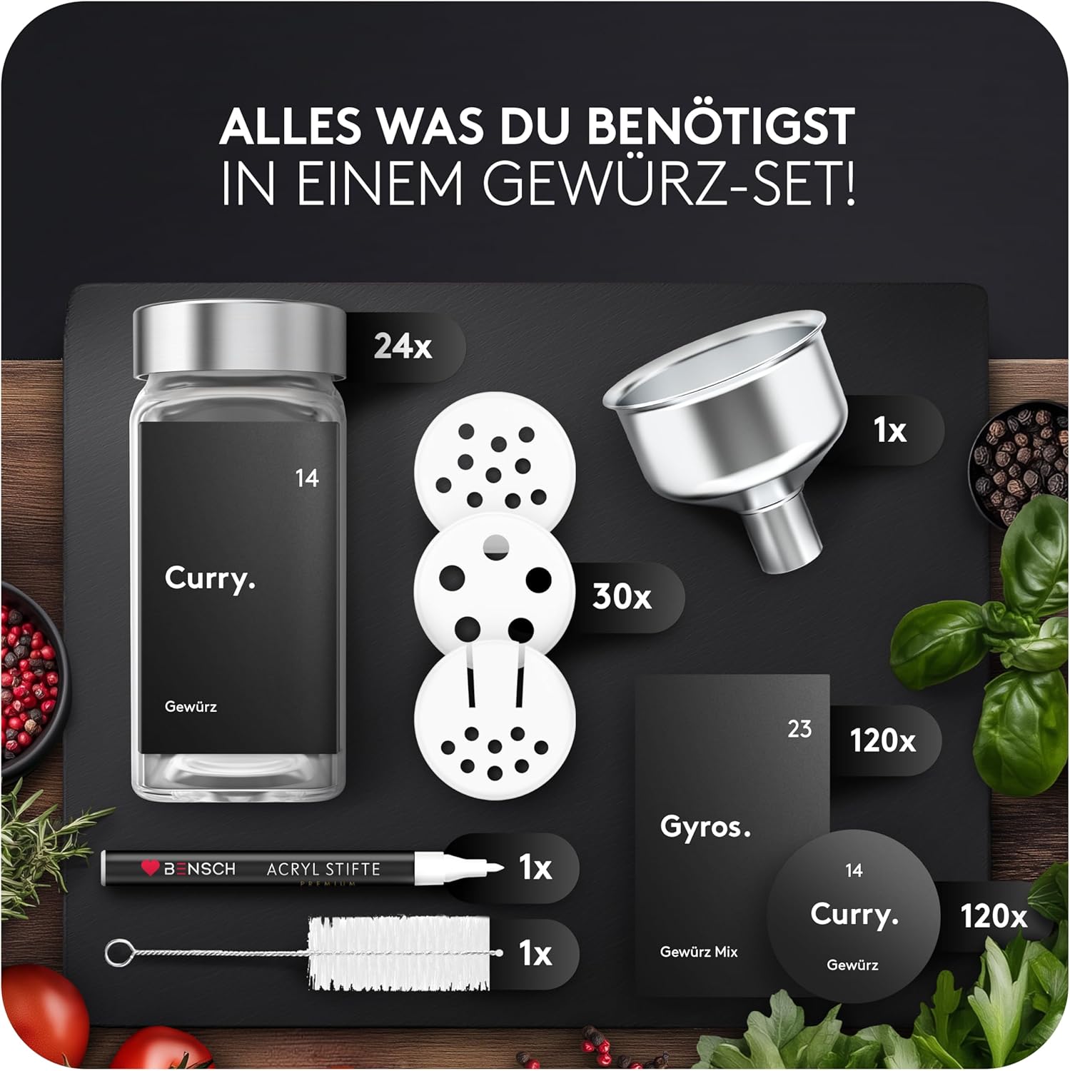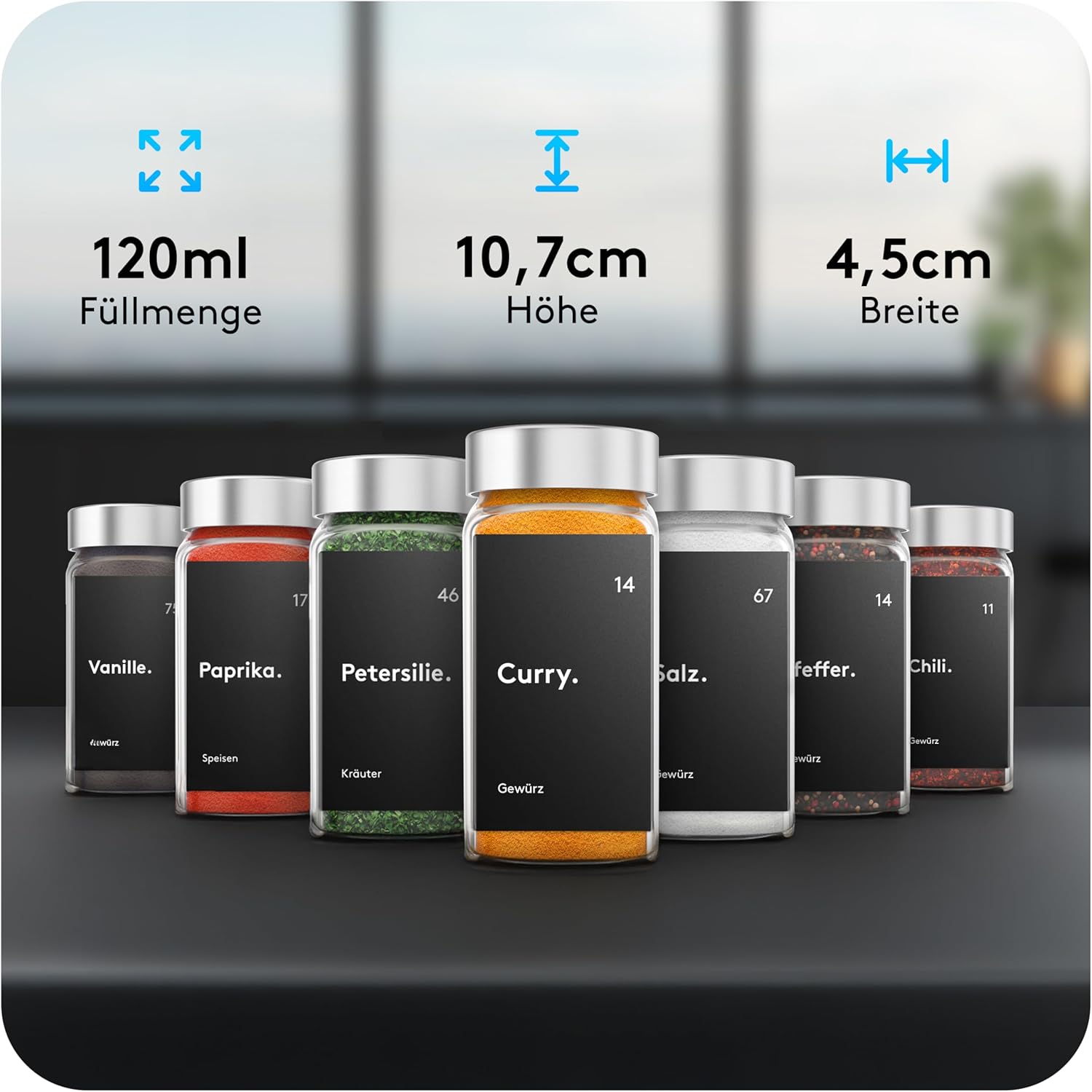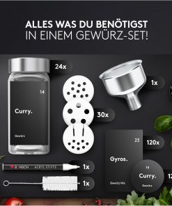 - 🌿 GROßES KOMPLETT-SET – Das Set kommt inklusive 24 Gläsern (120ml), 30 Streueinsätzen (groß | klein | mix), 240 deutschen Etiketten, 1x weißen Acrylstift, 1x Reinigungsbürste und 1x Edelstahltrichter.