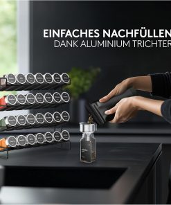 Sehr praktisches Gewürzgläser-Set: die 24 eckigen Gläser wirken hochwertig und stehen platzsparend, die Streueinsätze funktionieren zuverlässig und das Beschriften mit den 240 Etiketten und dem Acrylstift ist super einfach. Der Edelstahltrichter erleichtert das Befüllen, die Deckel sitzen gut und alles wirkt robust genug für den Alltag. Bin sehr zufrieden und kann das Set empfehlen.